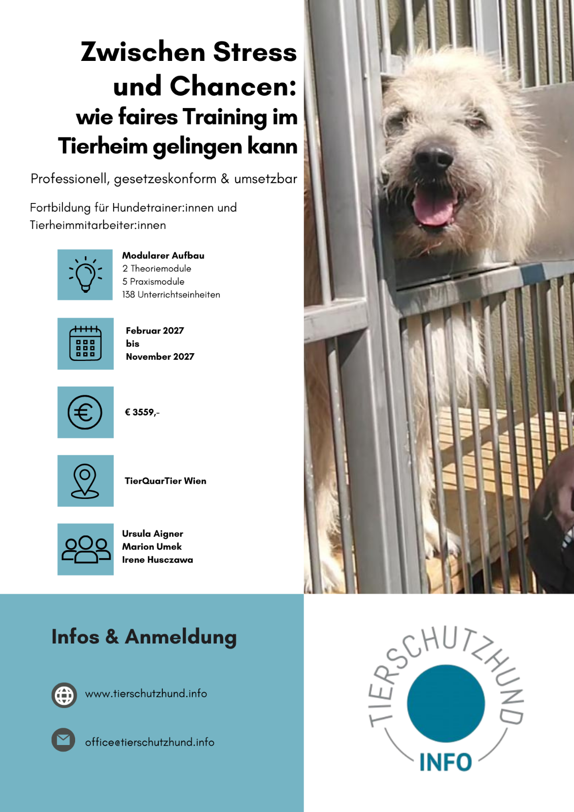 Um Hundetrainer:innen bzw. Mitarbeiter:innen in Tierschutzeinrichtungen Praxis in Umgang und Training von Hunden in Tierheimen zu geben, wurde die Fortbildung „Zwischen Stress und Chancen – wie faires Training im Tierheim gelingen kann“ ins Leben gerufen, als Kooperation von tierschutzhund.info und dem TierQuarTier Wien.